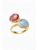 Sortija de oro amarillo de 18 kilates con una piedra de aguamarina y una piedra de rodolita
